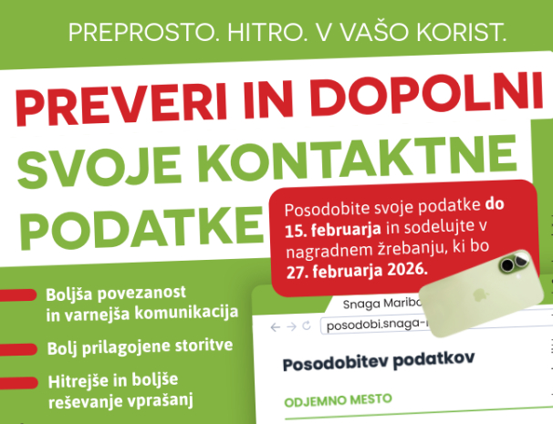Posodobite podatke do 15. februarja in sodelujte v nagradnem žrebanju za bogate nagrade V Javnem podjetju Snaga skrbimo za urejene, točne in varne...